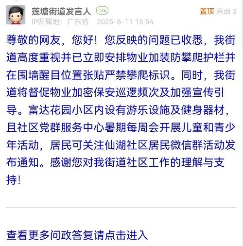 尊敬的網(wǎng)友,您好!您反映的問題已收悉,我街道高度重視并已立即安排物業(yè)加裝防攀爬護(hù)欄并在圍墻醒目位置張貼嚴(yán)禁攀爬標(biāo)識。同時,我街道將督促物業(yè)加密保安巡邏頻次及加強宣傳引導(dǎo)。富達(dá)花園小區(qū)內(nèi)設(shè)有游樂設(shè)施及健身器材,且社區(qū)黨群服務(wù)中心暑期每周會開展兒童和青少年活動,居民可關(guān)注仙湖社區(qū)居民微信群活動發(fā)布通知。感謝您對我街道社區(qū)工作的理解與支持!
