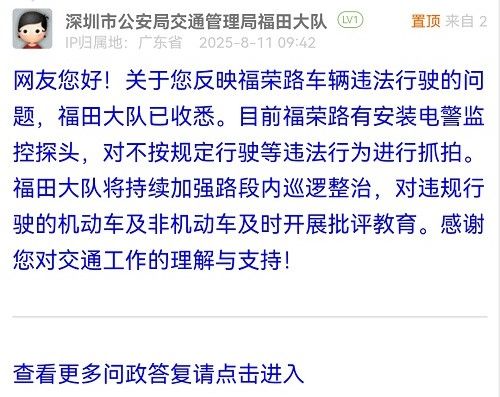 網(wǎng)友您好!關(guān)于您反映福榮路車輛違法行駛的問題,福田大隊已收悉。目前福榮路有安裝電警監(jiān)控探頭,對不按規(guī)定行駛等違法行為進(jìn)行抓拍。福田大隊將持續(xù)加強路段內(nèi)巡邏整治,對違規(guī)行駛的機動車及非機動車及時開展批評教育。感謝您對交通工作的理解與支持!