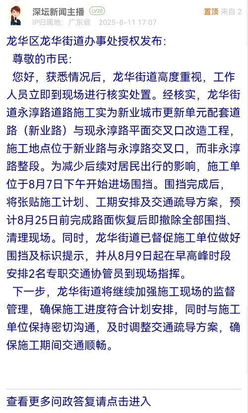 您好,獲悉情況后,龍華街道高度重視,工作人員立即到現(xiàn)場進(jìn)行核實處置。經(jīng)核實,龍華街道永淳路道路施工實為新業(yè)城市更新單元配套道路(新業(yè)路)與現(xiàn)永淳路平面交叉口改造工程,施工地點位于新業(yè)路與永淳路交叉口,而非永淳路整段。為減少后續(xù)對居民出行的影響,施工單位于8月7日下午開始進(jìn)場圍擋。圍擋完成后,將張貼施工計劃、工期安排及交通疏導(dǎo)方案,預(yù)計8月25日前完成路面恢復(fù)后即撤除全部圍擋、清理現(xiàn)場。同時,龍華街道已督促施工單位做好圍擋及標(biāo)識提示,并從8月9日起在早高峰時段安排2名專職交通協(xié)管員到現(xiàn)場指揮。