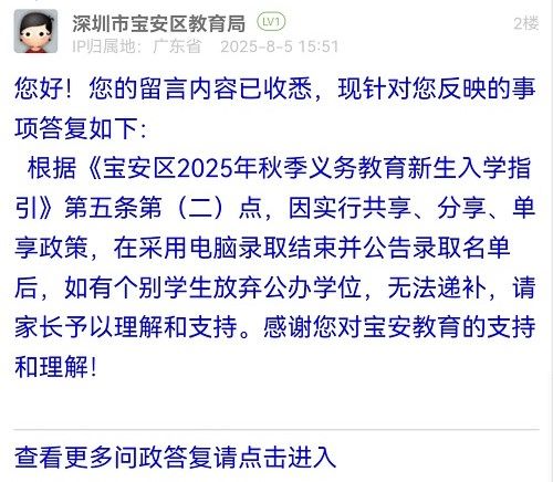 根據(jù)《寶安區(qū)2025年秋季義務(wù)教育新生入學(xué)指引》第五條第(二)點,因?qū)嵭泄蚕怼⒎窒?、單享政策,在采用電腦錄取結(jié)束并公告錄取名單后,如有個別學(xué)生放棄公辦學(xué)位,無法遞補,請家長予以理解和支持。感謝您對寶安教育的支持和理解!