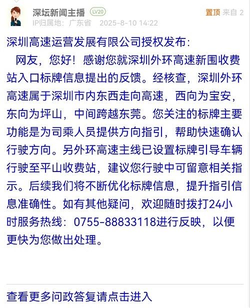 網(wǎng)友,您好!感謝您就深圳外環(huán)高速新圍收費站入口標(biāo)牌信息提出的反饋。經(jīng)核查,深圳外環(huán)高速屬于深圳市內(nèi)東西走向高速,西向為寶安,東向為坪山,中間跨越東莞。您關(guān)注的標(biāo)牌主要功能是為司乘人員提供方向指引,幫助快速確認(rèn)行駛方向。另外環(huán)高速主線已設(shè)置標(biāo)牌引導(dǎo)車輛行駛至平山收費站,建議您行駛中可留意相關(guān)指示。后續(xù)我們將不斷優(yōu)化標(biāo)牌信息,提升指引信息準(zhǔn)確性。如有其他疑問,歡迎隨時撥打24小時服務(wù)熱線:0755-88833118進(jìn)行反映,以便更快為您做出處理。