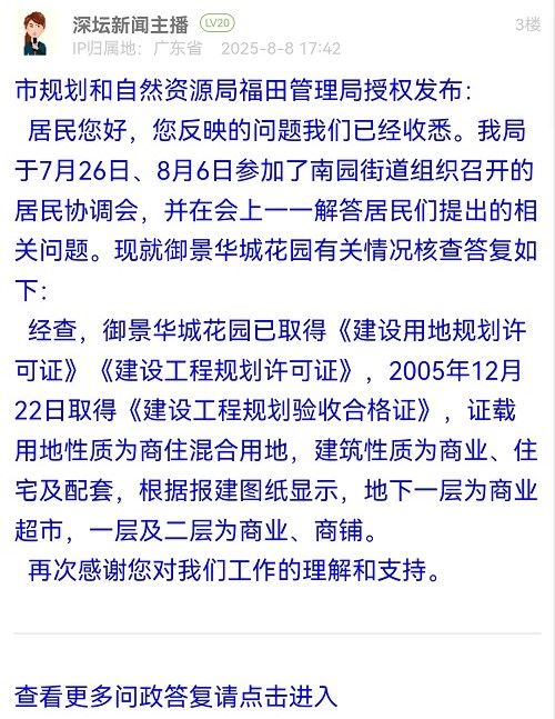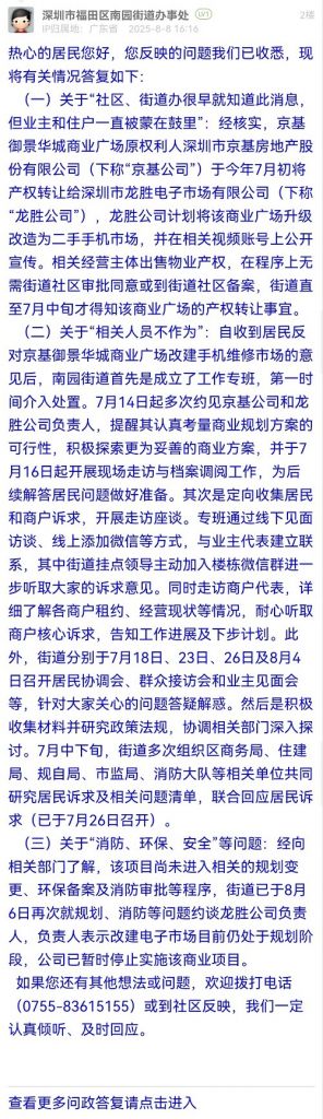 (二)關(guān)于“相關(guān)人員不作為”:自收到居民反對京基御景華城商業(yè)廣場改建手機維修市場的意見后,南園街道首先是成立了工作專班,第一時間介入處置。7月14日起多次約見京基公司和龍勝公司負(fù)責(zé)人,提醒其認(rèn)真考量商業(yè)規(guī)劃方案的可行性,積極探索更為妥善的商業(yè)方案,并于7月16日起開展現(xiàn)場走訪與檔案調(diào)閱工作,為后續(xù)解答居民問題做好準(zhǔn)備。其次是定向收集居民和商戶訴求,開展走訪座談。專班通過線下見面訪談、線上添加微信等方式,與業(yè)主代表建立聯(lián)系,其中街道掛點領(lǐng)導(dǎo)主動加入樓棟微信群進(jìn)一步聽取大家的訴求意見。同時走訪商戶代表,詳細(xì)了解各商戶租約、經(jīng)營現(xiàn)狀等情況,耐心聽取商戶核心訴求,告知工作進(jìn)展及下步計劃。此外,街道分別于7月18日、23日、26日及8月4日召開居民協(xié)調(diào)會、群眾接訪會和業(yè)主見面會等,針對大家關(guān)心的問題答疑解惑。然后是積極收集材料并研究政策法規(guī),協(xié)調(diào)相關(guān)部門深入探討。7月中下旬,街道多次組織區(qū)商務(wù)局、住建局、規(guī)自局、市監(jiān)局、消防大隊等相關(guān)單位共同研究居民訴求及相關(guān)問題清單,聯(lián)合回應(yīng)居民訴求(已于7月26日召開)。