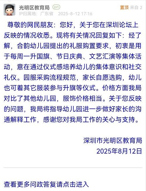 尊敬的網(wǎng)民朋友:您好,關(guān)于您在深圳論壇上反映的情況收悉?,F(xiàn)將有關(guān)情況回復(fù)如下:經(jīng)了解,合韻幼兒園提出的禮服購置要求,初衷是用于每周一升國旗、節(jié)日慶典、文藝匯演等集體活動,意在通過儀式感培養(yǎng)幼兒的集體意識和社交禮儀。園服采購流程規(guī)范,家長自愿選購,幼兒也可著其它服裝參與升旗等儀式。價格方面我局對比了其他幼兒園,服飾價格相當(dāng)。關(guān)于您反映的問題,我局將指導(dǎo)幼兒園進(jìn)一步做好家長的溝通解釋工作,感謝您對我局工作的關(guān)心與支持。