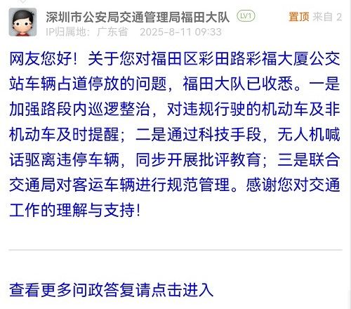 網(wǎng)友您好!關(guān)于您對福田區(qū)彩田路彩福大廈公交站車輛占道停放的問題,福田大隊已收悉。一是加強路段內(nèi)巡邏整治,對違規(guī)行駛的機動車及非機動車及時提醒;二是通過科技手段,無人機喊話驅(qū)離違停車輛,同步開展批評教育;三是聯(lián)合交通局對客運車輛進(jìn)行規(guī)范管理。感謝您對交通工作的理解與支持!